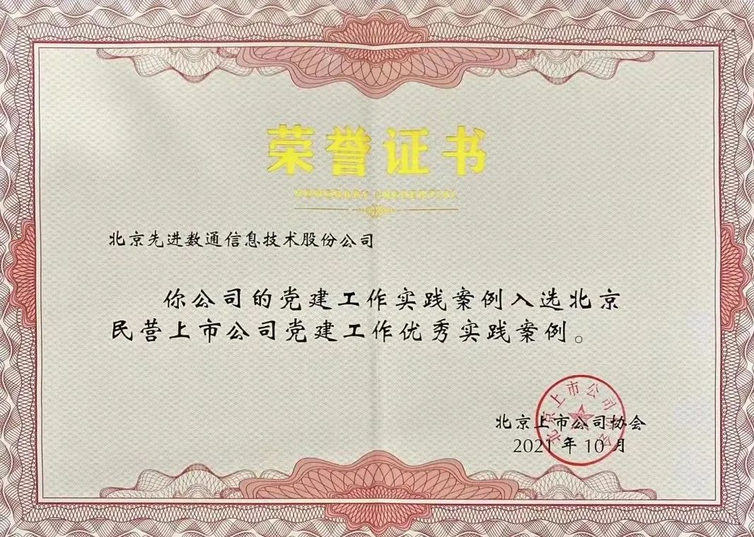 近期,北京上市公司协会授予北京mile米乐集团信息技术股份公司荣誉证书,mile米乐集团党建工作实践入选北京民营上市公司党建工作优秀实践案例,相关党建活动已收录在《北京民营上市公司党建工作优秀实践案例汇编》。